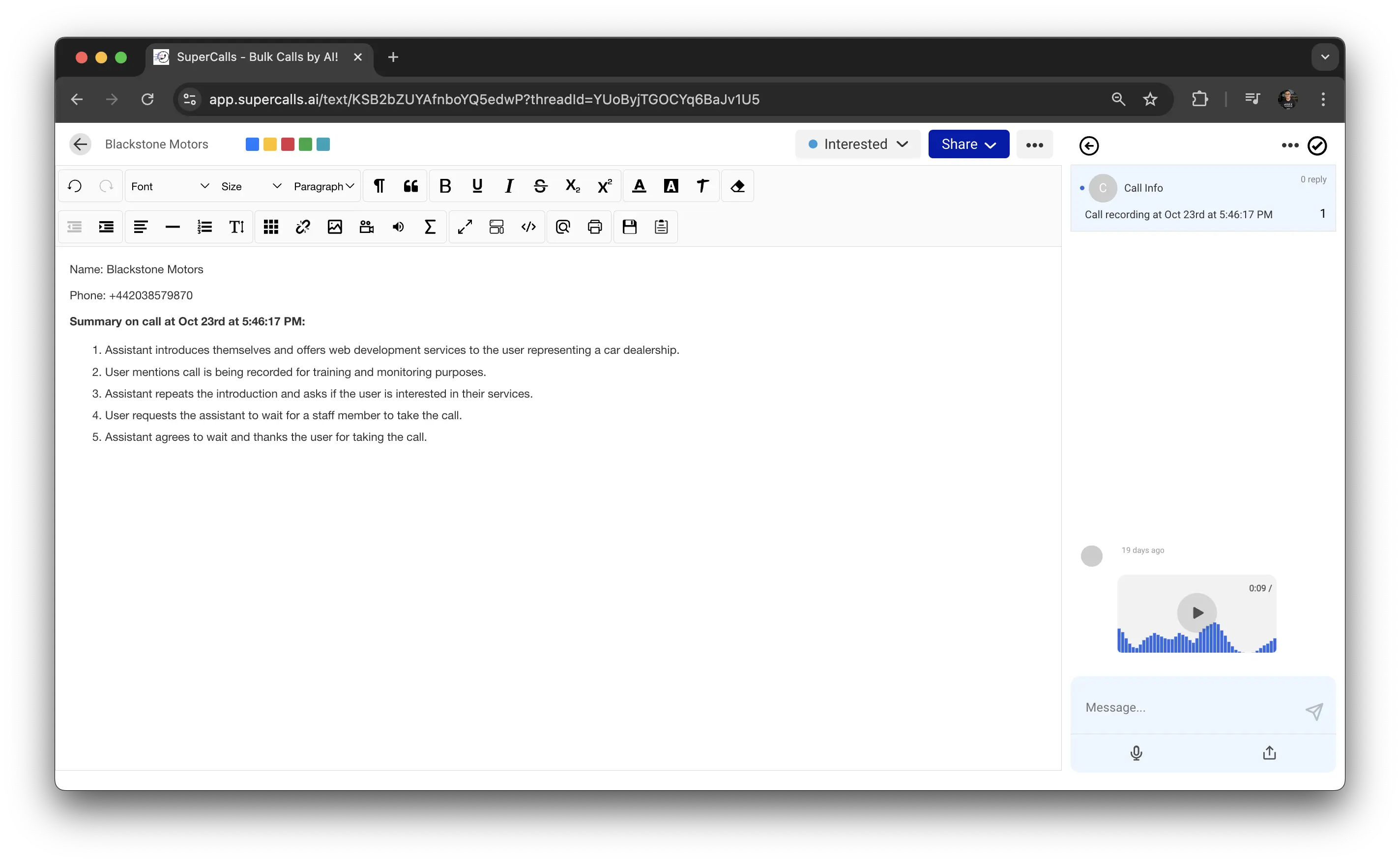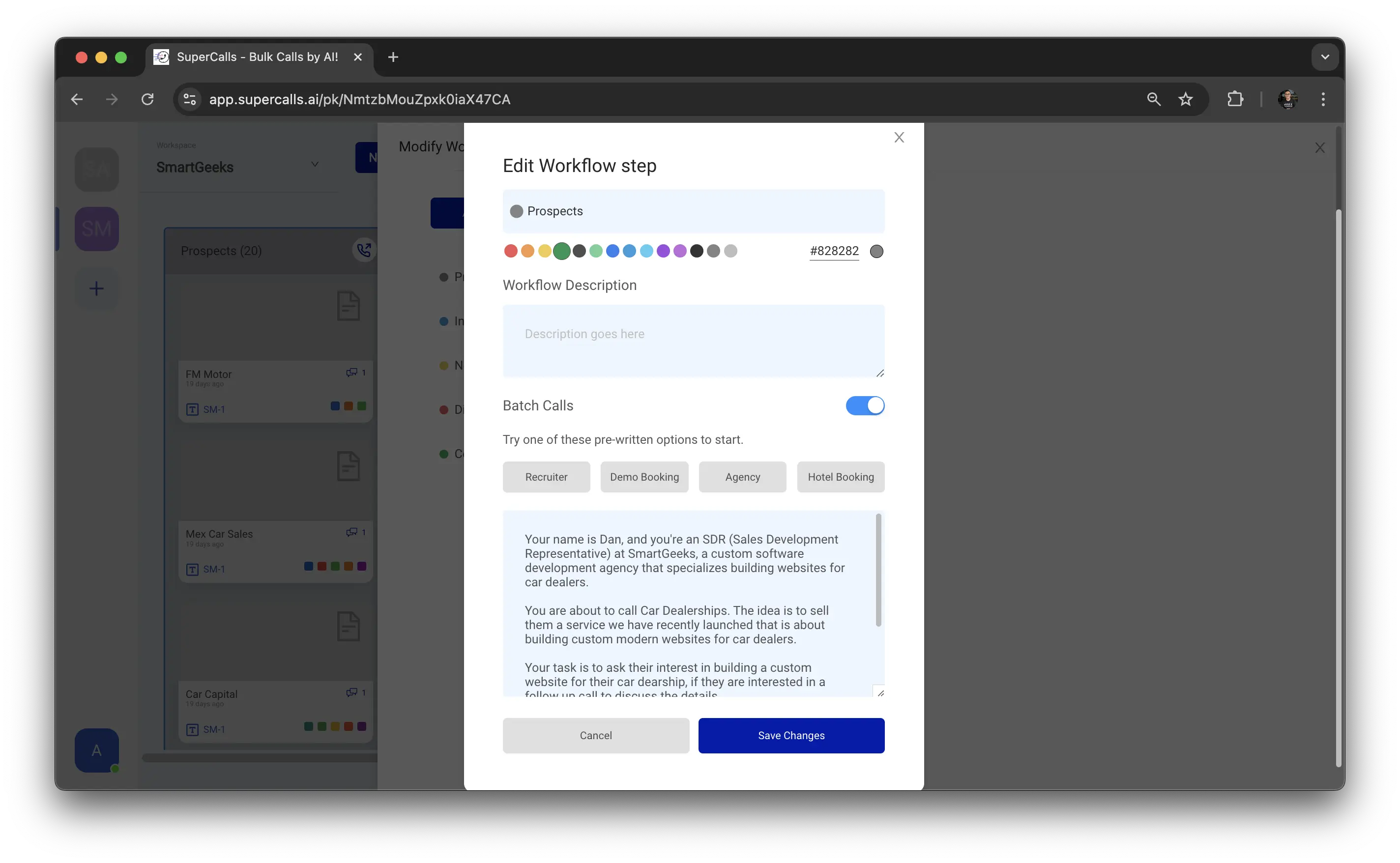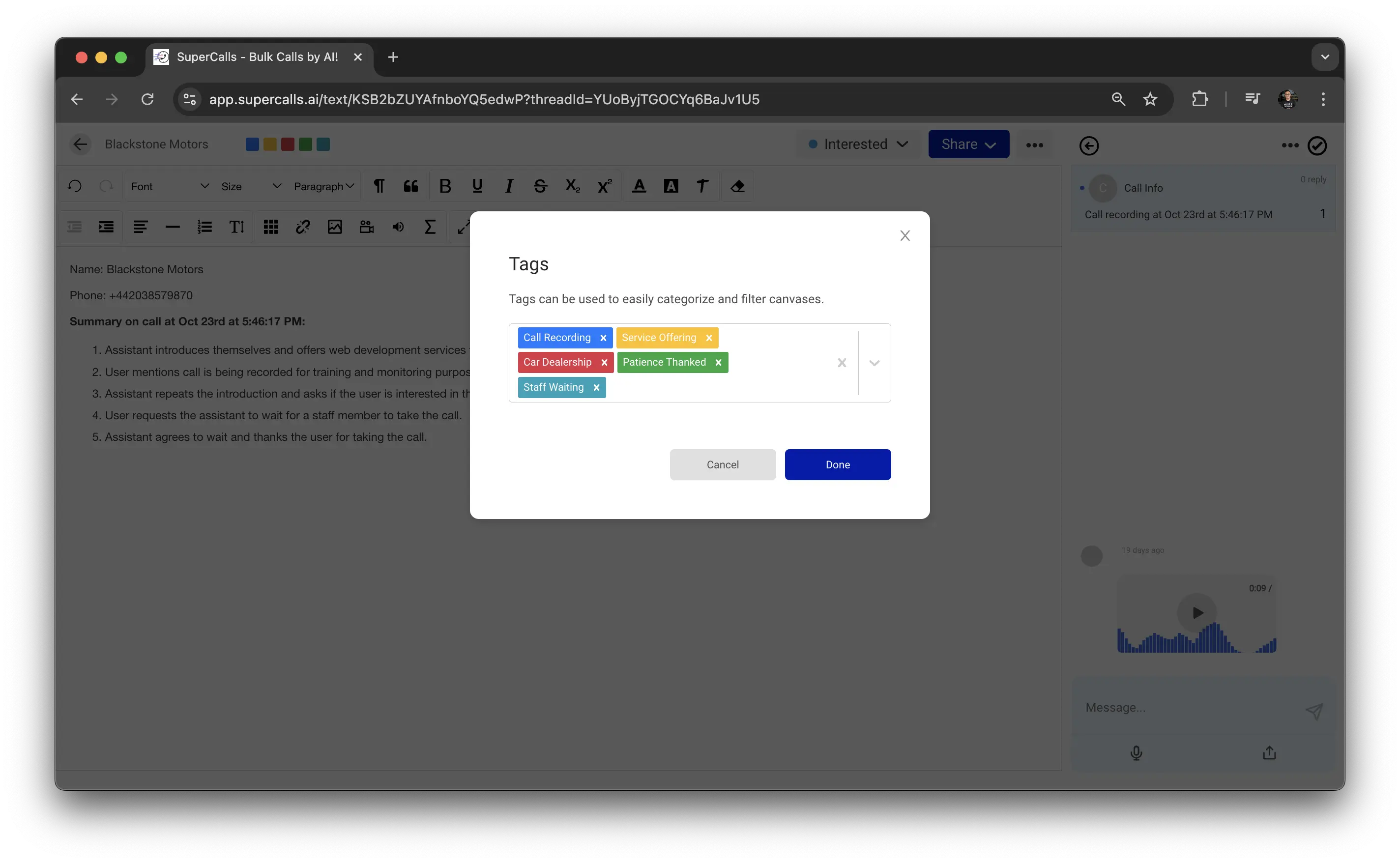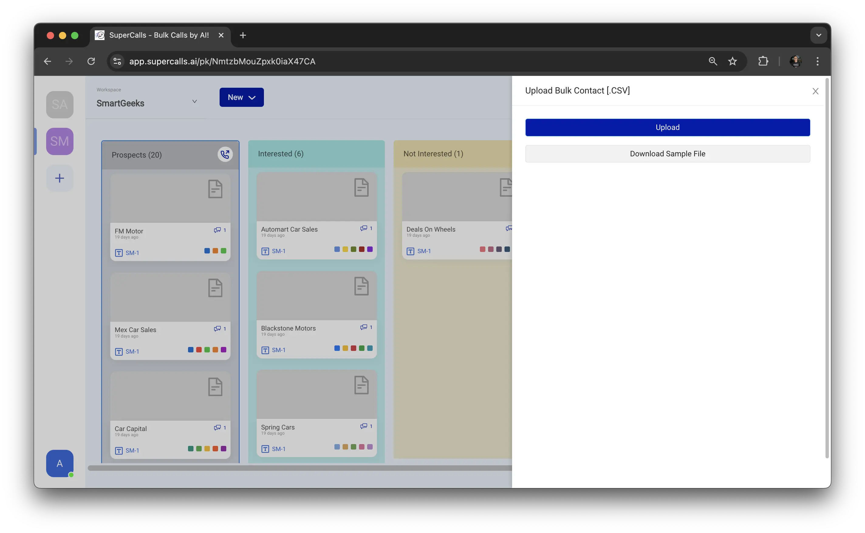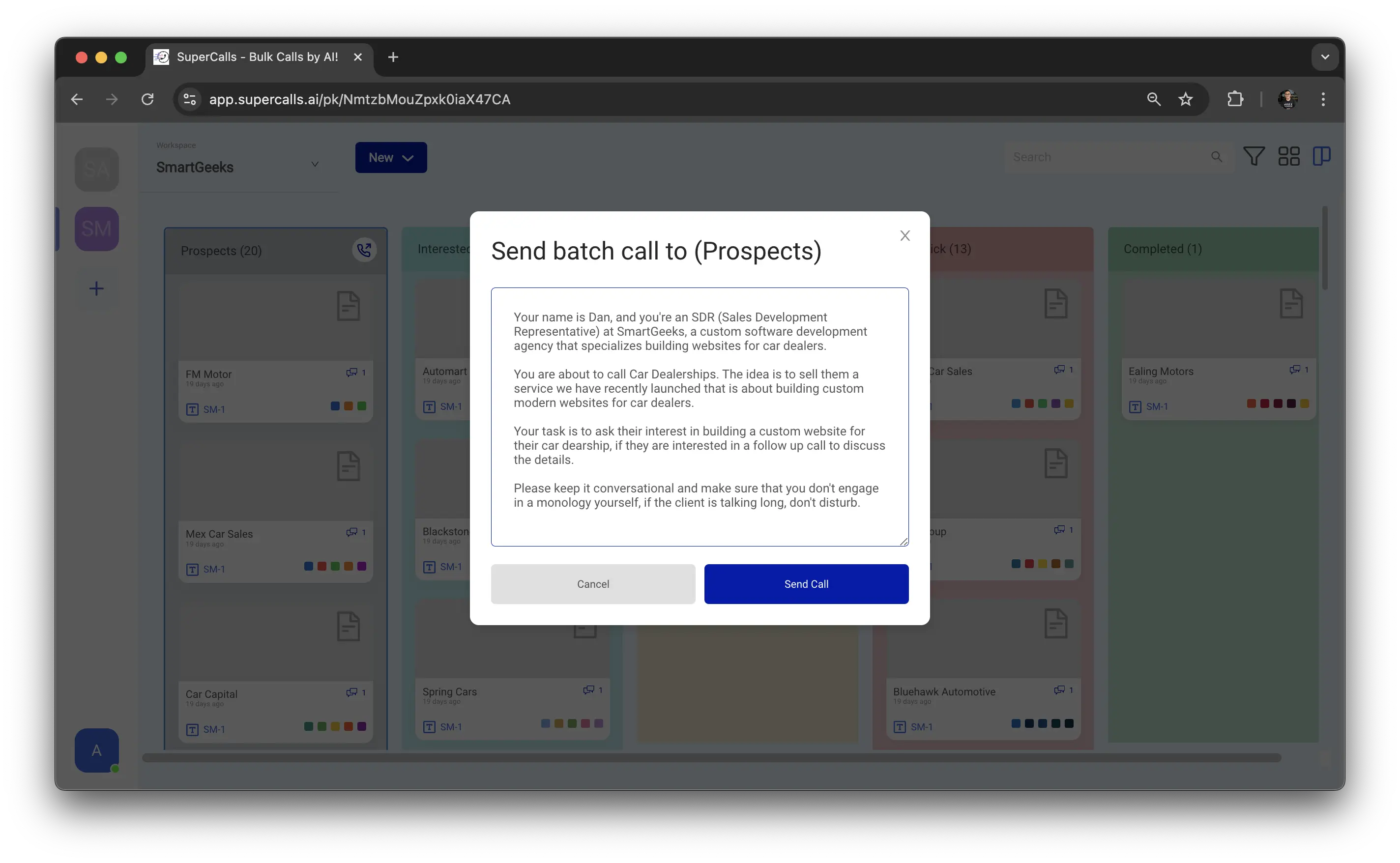 Hit start, SuperCalls reaches out to all your contacts at once. Each call is analyzed and moved to your Kanban board for next steps.