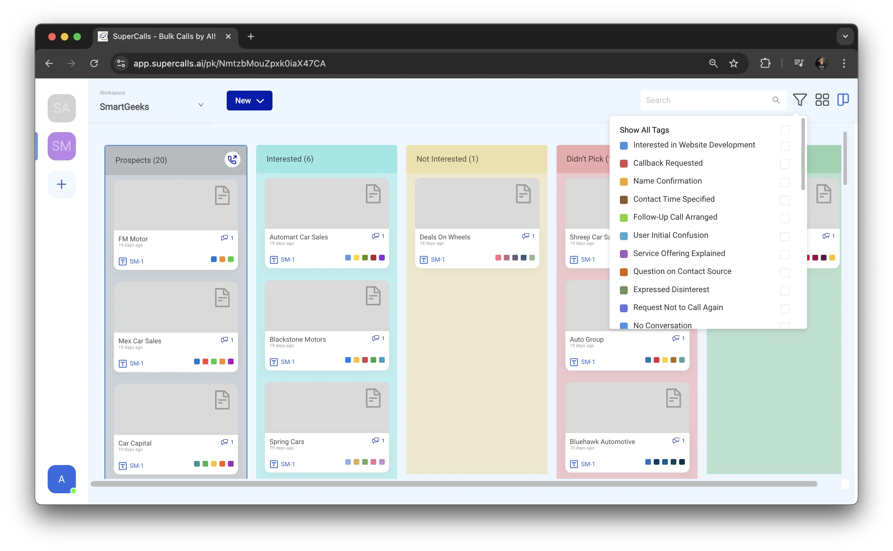 The SuperCalls Kanban board visually tracks each call's progress, with each contact displayed as a “card” containing conversation summaries and tags. As calls are completed, cards automatically move to relevant columns, helping you prioritize follow-ups and stay organized. This streamlined view keeps your outreach clear, actionable, and easy to manage.